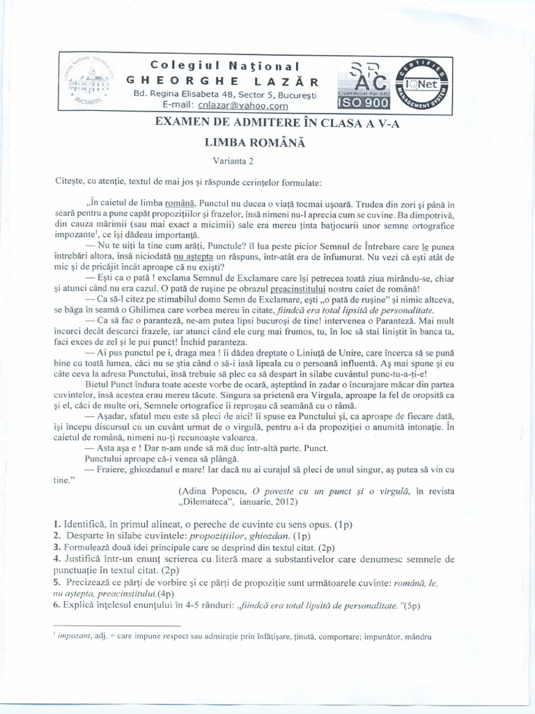 Limba Romana Subiect 2015 Admitere Clasa A V A Liceul Lazar