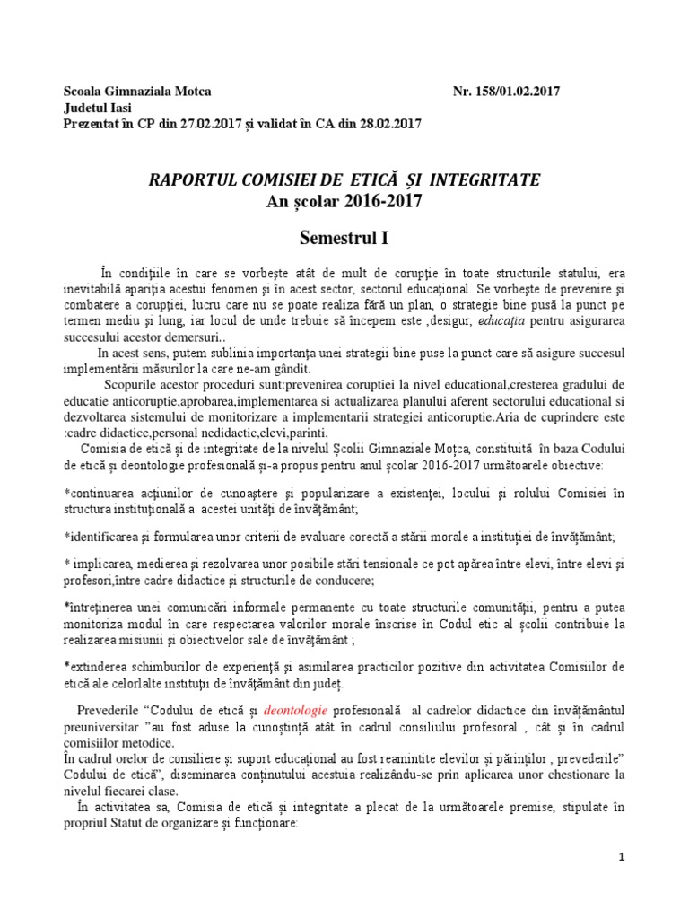Raportul Comisiei De Etică și Integritate An școlar 2016 2017 Semestrul I